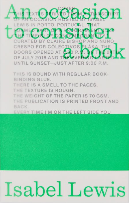 Isabel Lewis is an artist interested in creating multisensory experiences, collapsing formal boundaries, and centering collectivity. Consistent with the artist’s interest in hosting and storytelling, An Occasion to Consider a Book is an invitation to reflect on how a book might be performed in the world. It is Lewis’s first publication and marks the first time she conceptually addresses the physicality of the format, imbuing it with her expanded sense of the choreographic.