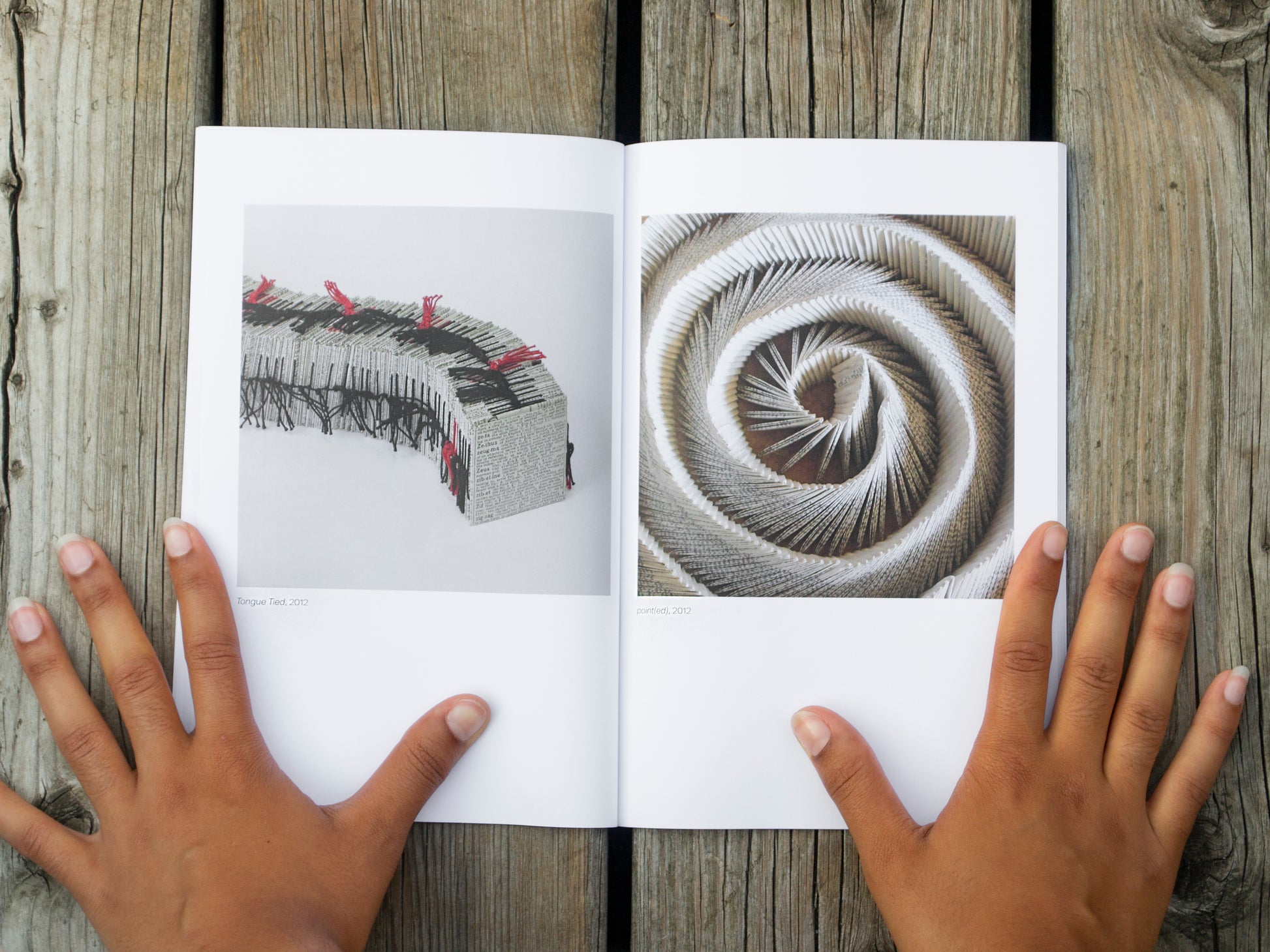 Exhibition catalogue for Elemental, a solo exhibition curated by CDCC director Shani K. Parsons featuring unique and editioned book works by Saskatchewan artist Cathryn Miller. Ranging from tiny folded paper projects to a new wall-sized composition, the thoughtfully conceived and often laboriously crafted works in the show represent a sustained investigation of manifold worlds, encompassing both the inner/outer, micro/macro, and meta/physical dimensions. In distilling her findings into the personal, poetic, and often playful objects on view, Miller’s observations and life experiences are made exquisitely manifest in the tactile materials, sequential structures, and storied logic of both traditional and invented or altered book forms.