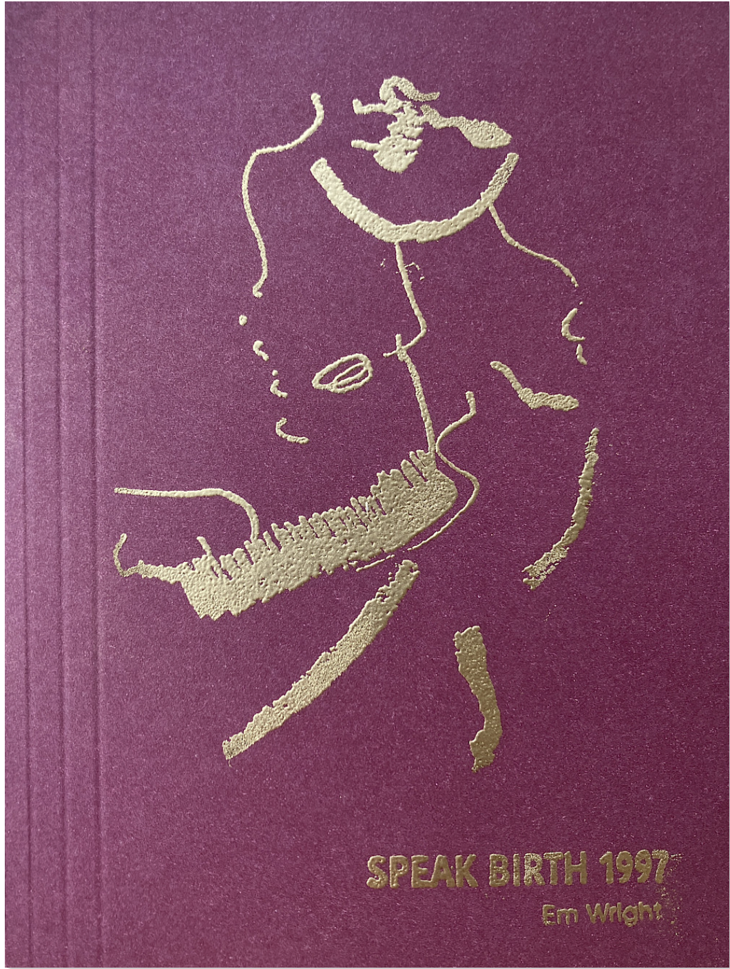 Speak Birth 1997 is Em Wright’s first collection of poetry. The volume includes poems that reflect on a pre–natal stroke the author survived and its relationship to their body and trans identity. Wright’s poems also reflect on physical fragility and medical intervention, and on connections of memory and family.