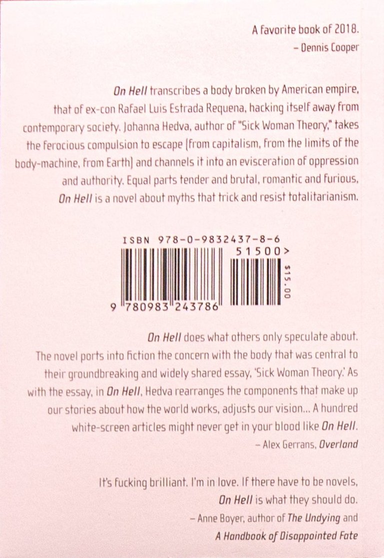 On Hell transcribes a body broken by American empire, that of ex-con Rafael Luis Estrada Requena, hacking itself away from contemporary society. Johanna Hedva, author of "Sick Woman Theory," takes the ferocious compulsion to escape (from capitalism, from the limits of the body-machine, from Earth) and channels it into an evisceration of oppression and authority. Equal parts tender and brutal, romantic and furious, On Hell is a novel about myths that trick and resist totalitarianism.