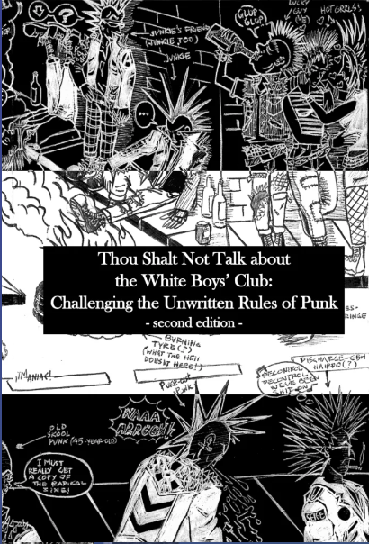 This updated second version of Thou Shalt Not Talk about the White Boys’ Club is 60 half-sized pages, over three times as long as the original, and includes expanded essays on topics like failed opportunities for white punks to work against white supremacy, the duality of excessive consumption or sobriety, the hierarchy of acceptable anger in punk, the effects of satire used in lyrics and band imagery, femmephobia and (internalized) misogyny, punk as an utopian ideal of white and male carelessness and ignorance, labeling critiques of shock value as “PC culture,” desirability politics, and mosh pit etiquette.